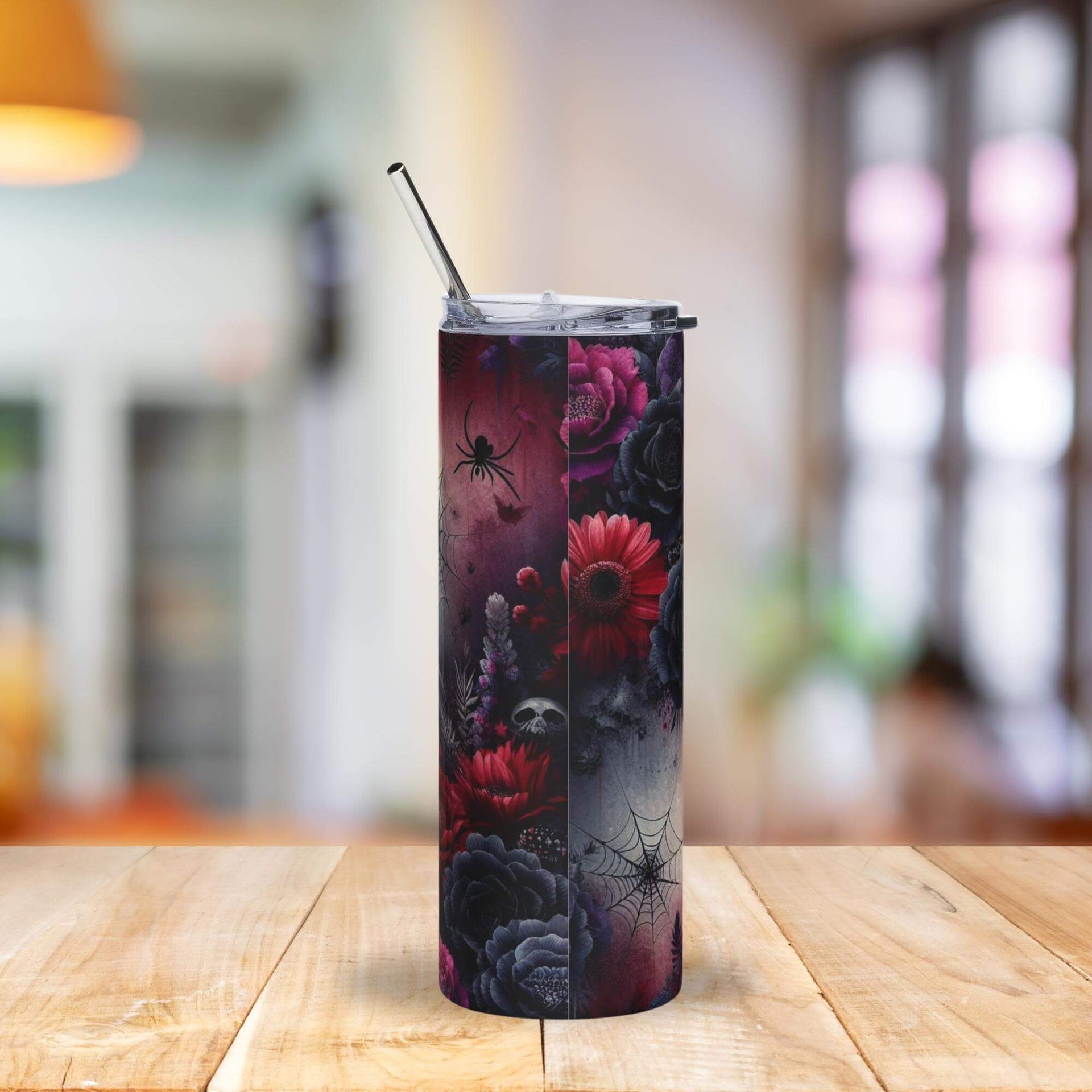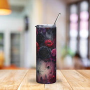 Gothic Floral Spiderweb Tumbler | 20oz Stainless Steel Cup with Dark Roses & Skull Accents