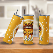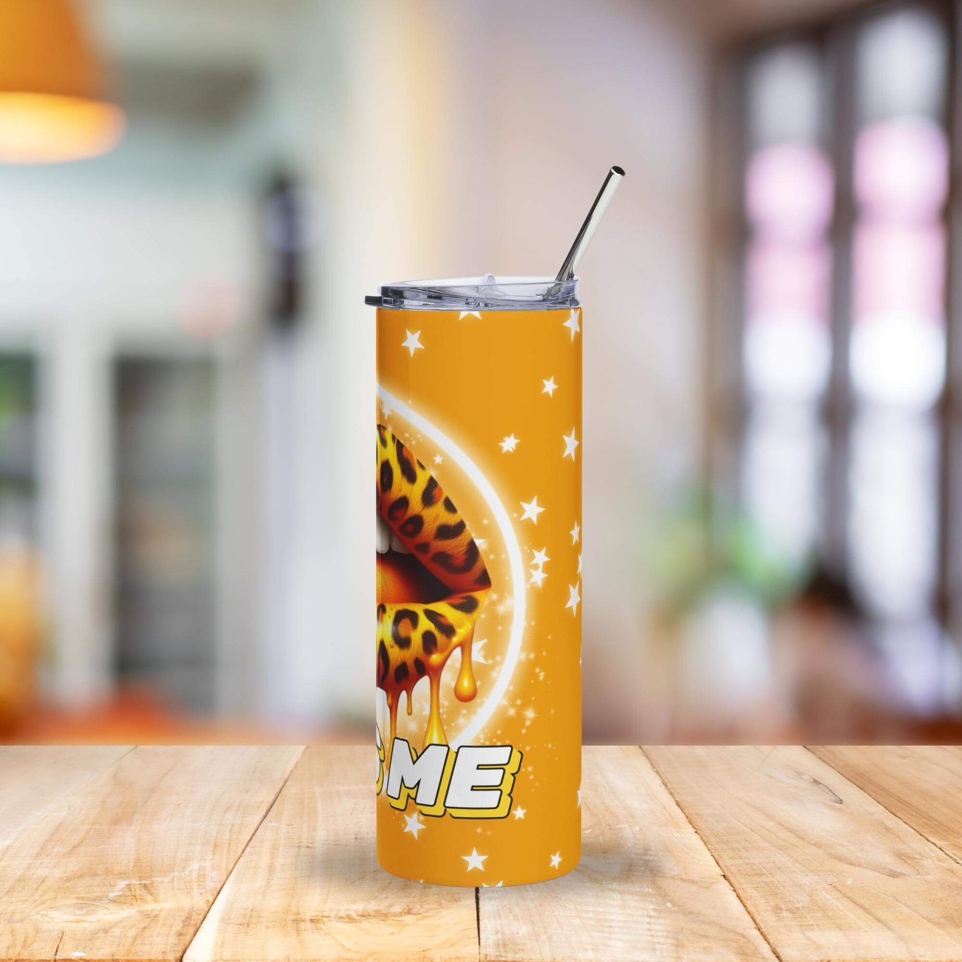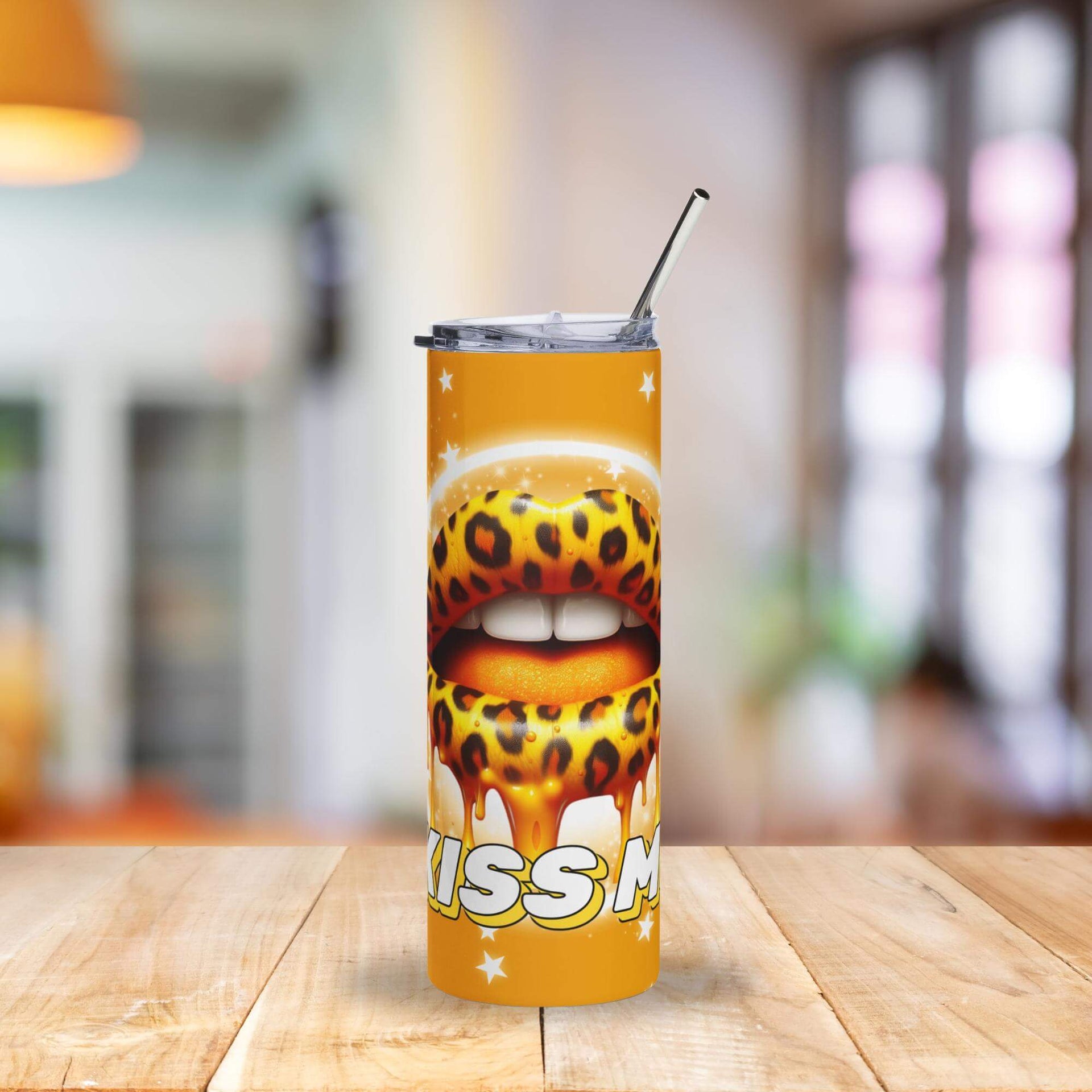 Make a bold statement with the Kiss Me Leopard Print Lips Tumbler—a fierce and glamorous 20oz stainless steel cup featuring sultry leopard-print lips dripping in golden honey, surrounded by a sprinkle of bright white stars on a rich golden background. Perfect for those who love their drinkware as vibrant and fearless as they are.