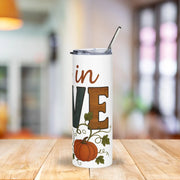 Fall in Love Pumpkin Tumbler | 20oz Stainless Steel Cup with Autumn Leaves & Buffalo Plaid
