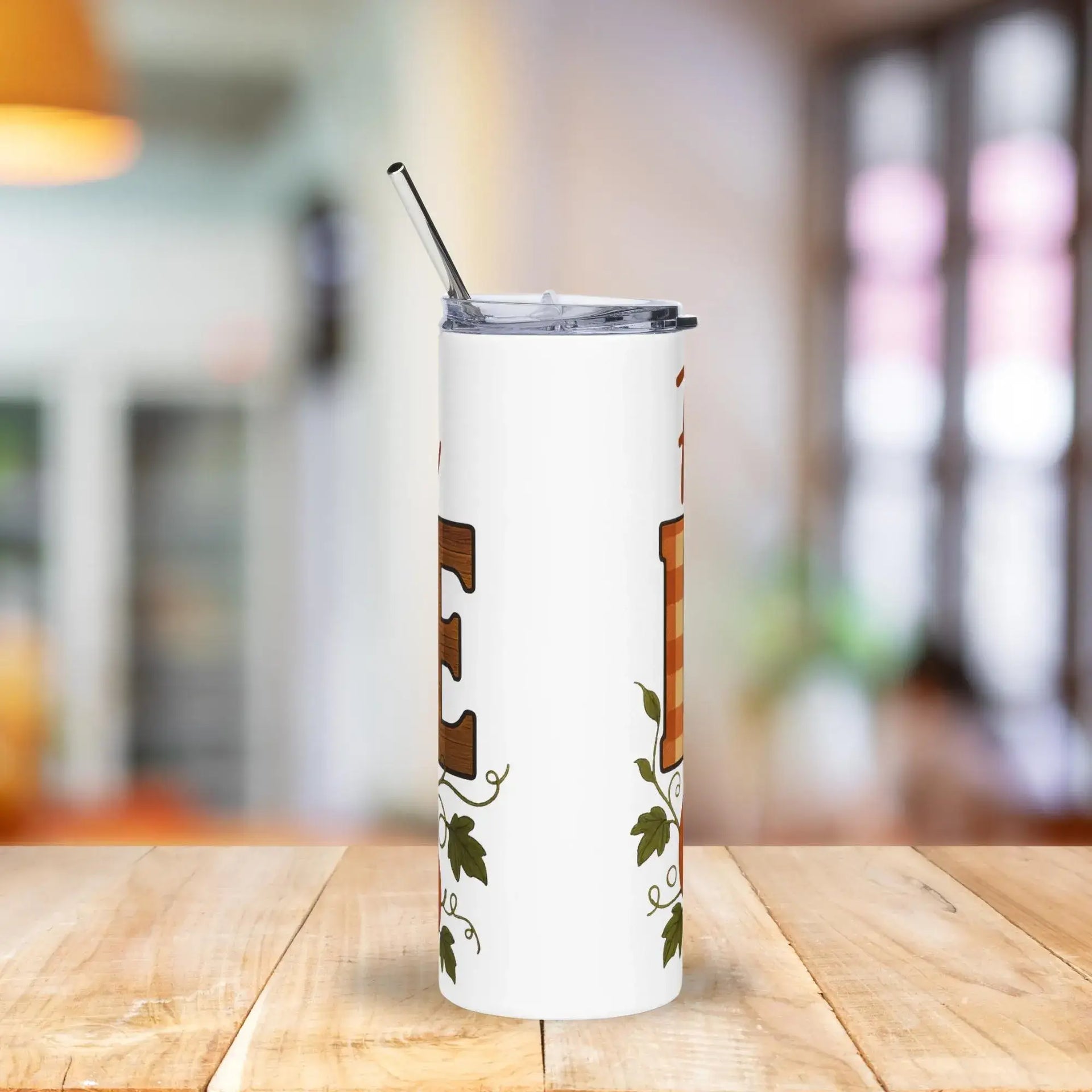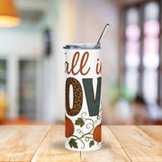Sip in style with the Fall in Love Pumpkin Tumbler—a cozy 20oz stainless steel cup that perfectly captures the charm of the autumn season. Featuring bold, rustic lettering accented with buffalo plaid and leopard print patterns, charming pumpkins, and swirling green vines, this design radiates warm fall vibes. The crisp white background makes the colors pop, giving it a fresh yet seasonal feel.
