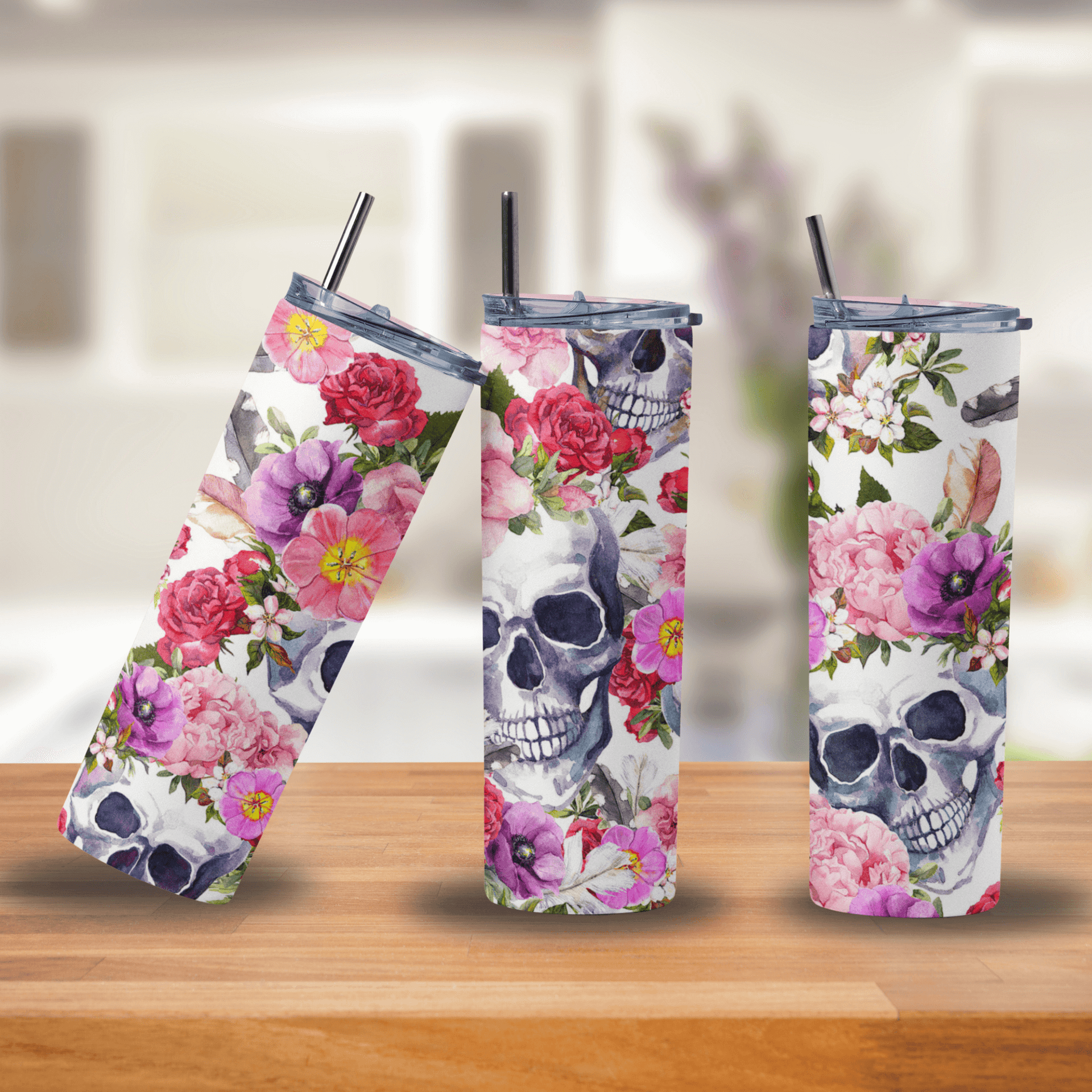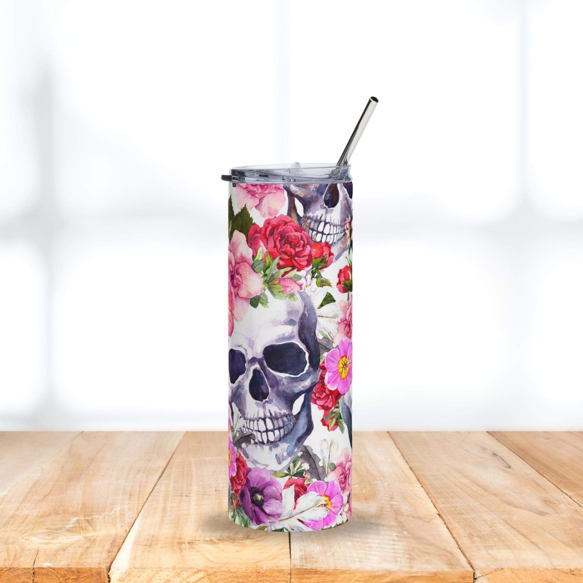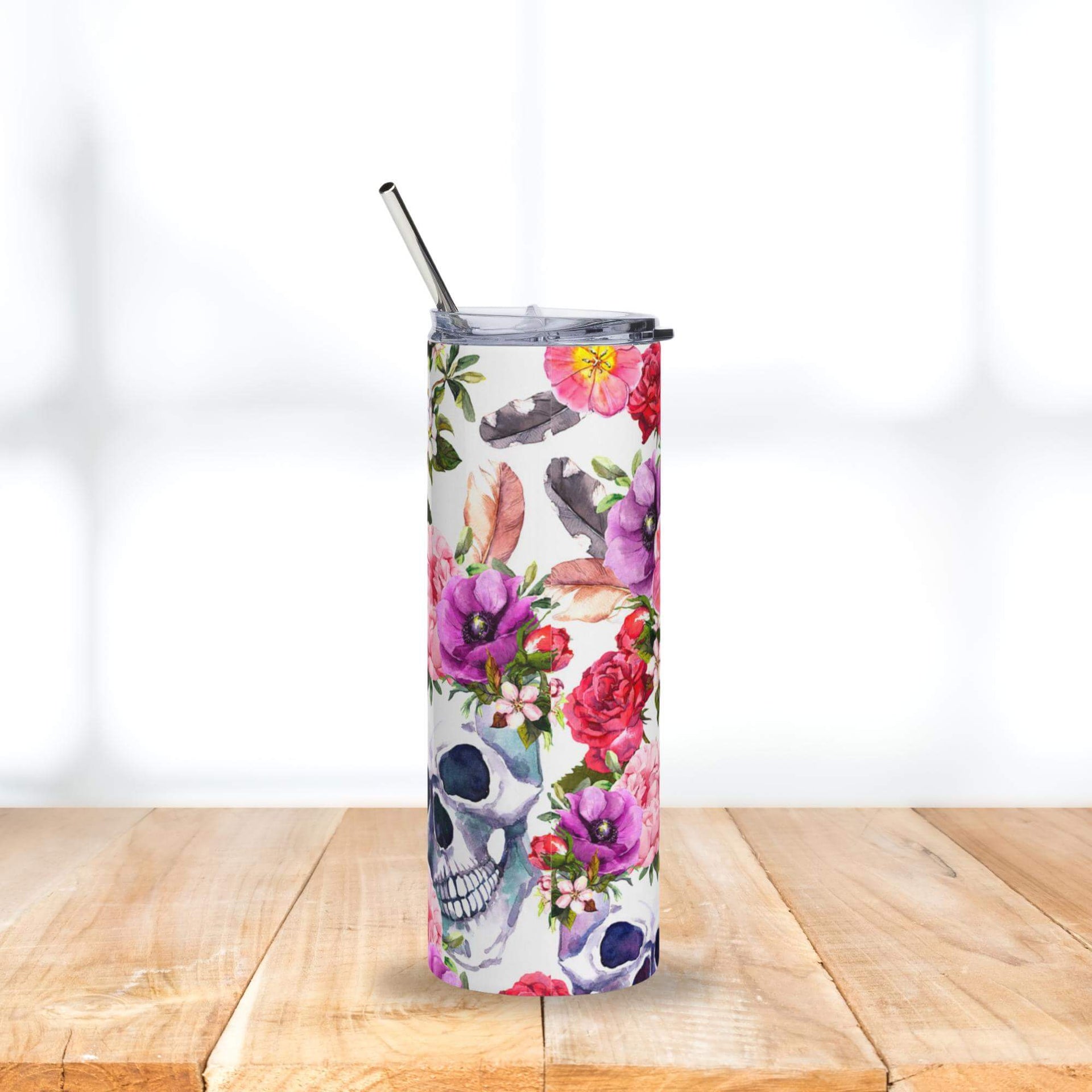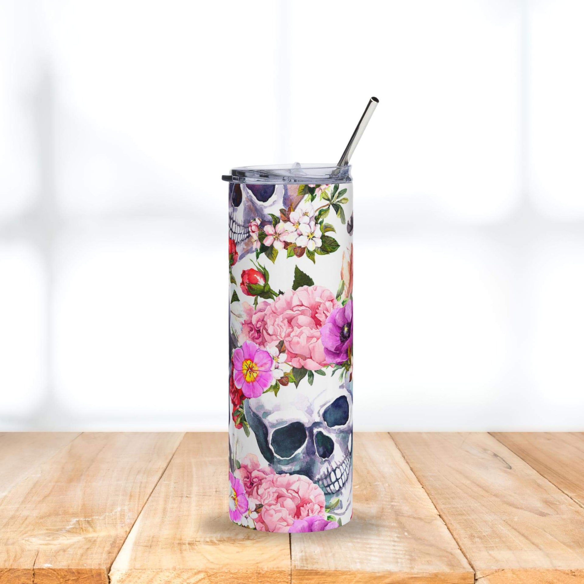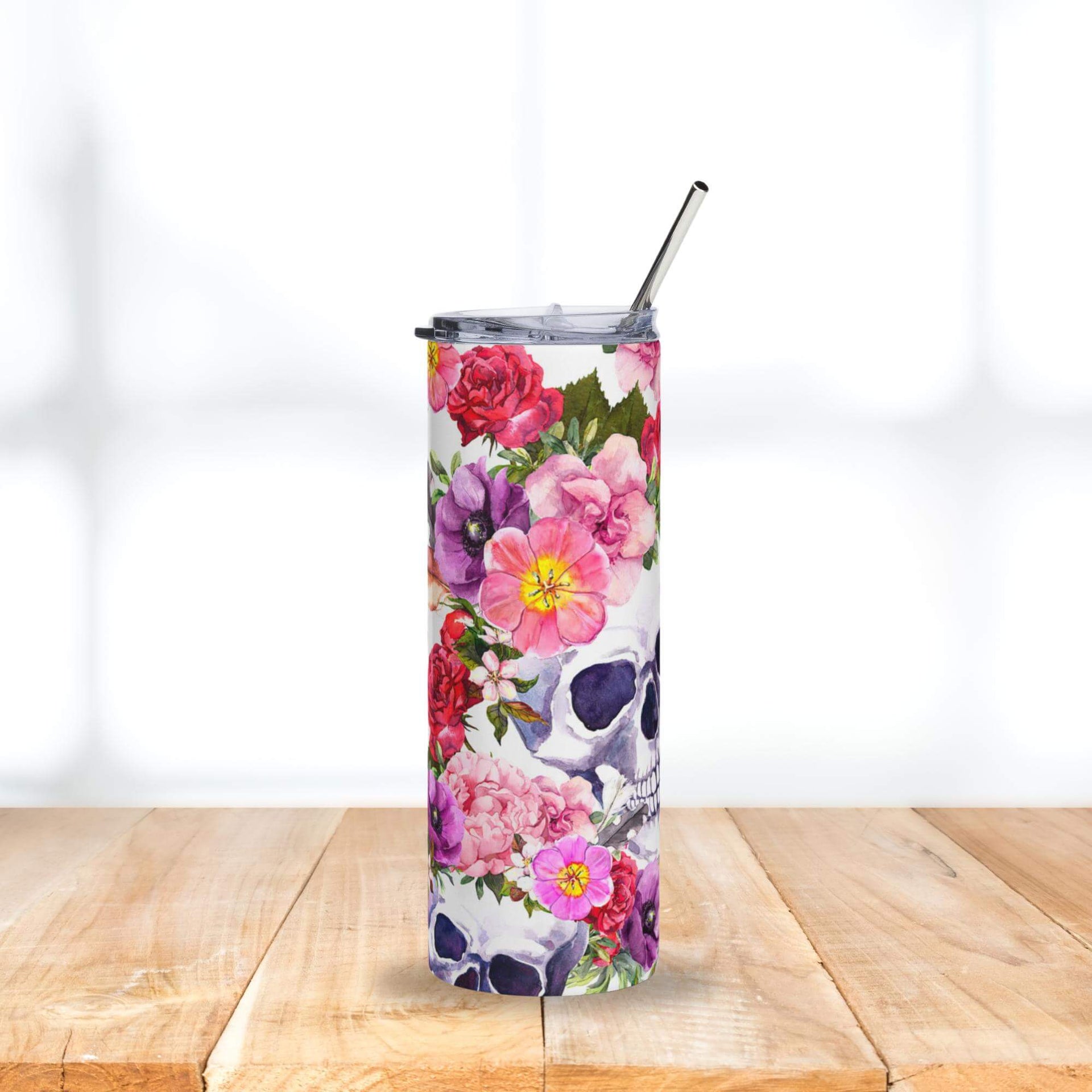 Floral Skull Tumbler | 20oz Stainless Steel Cup with Gothic Watercolor Flowers