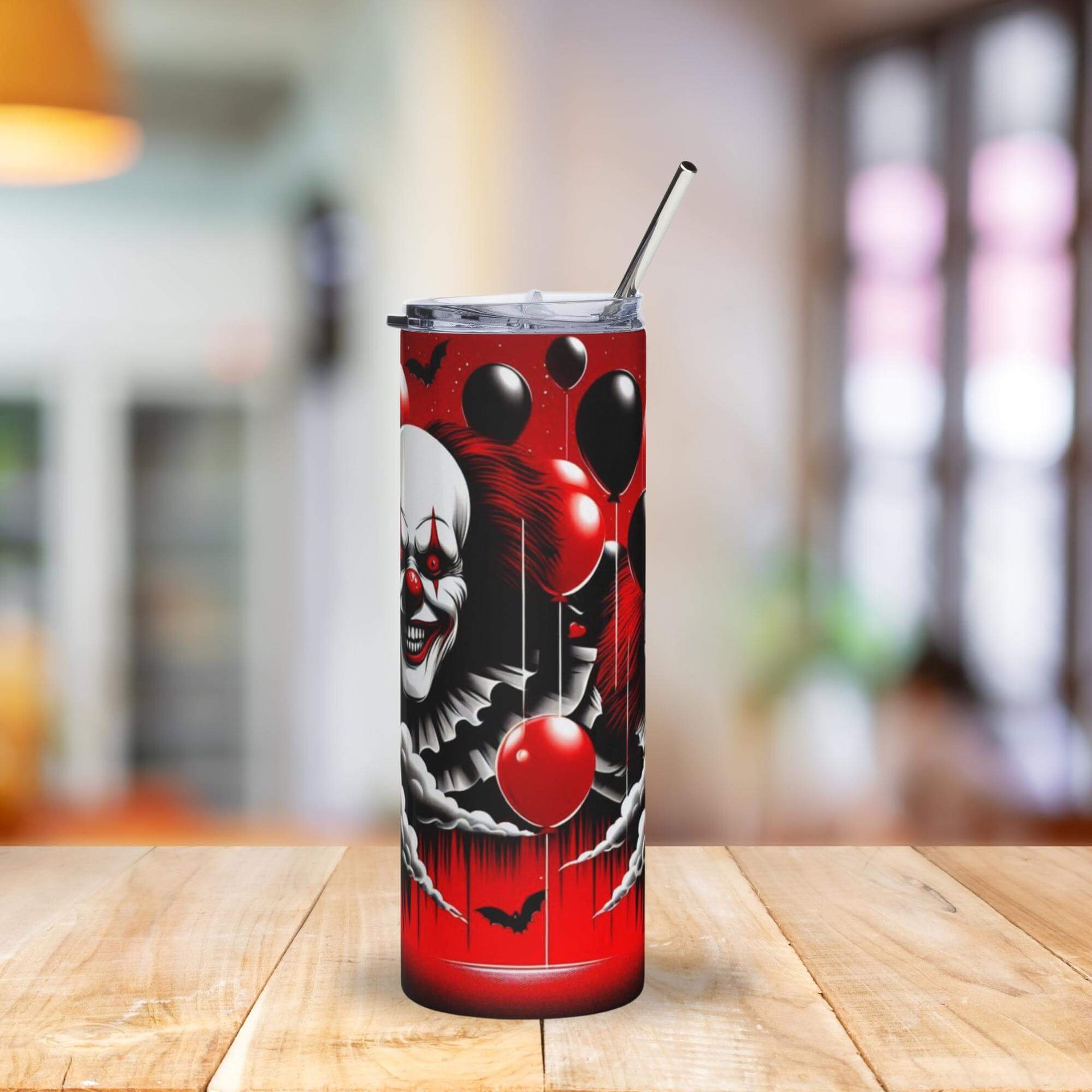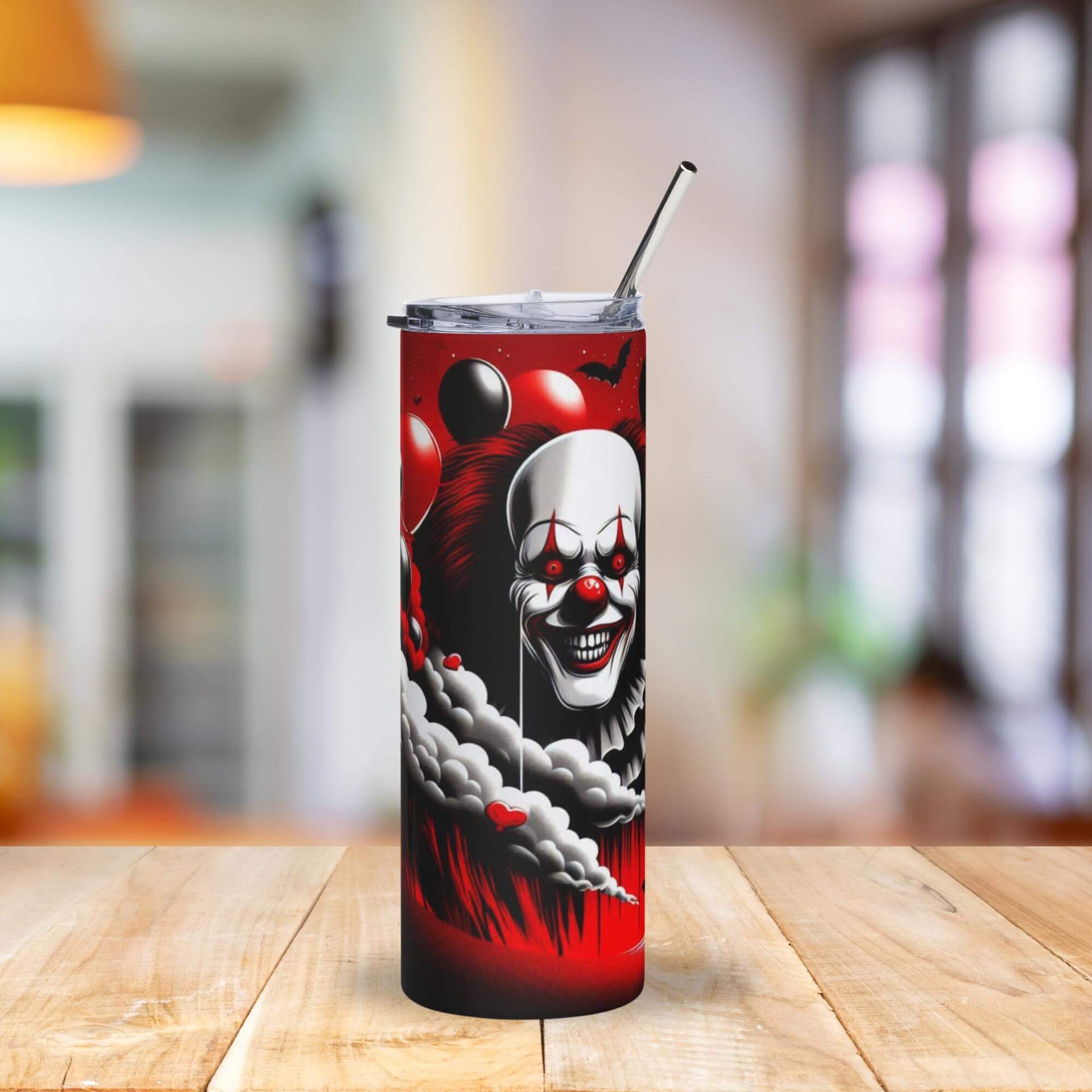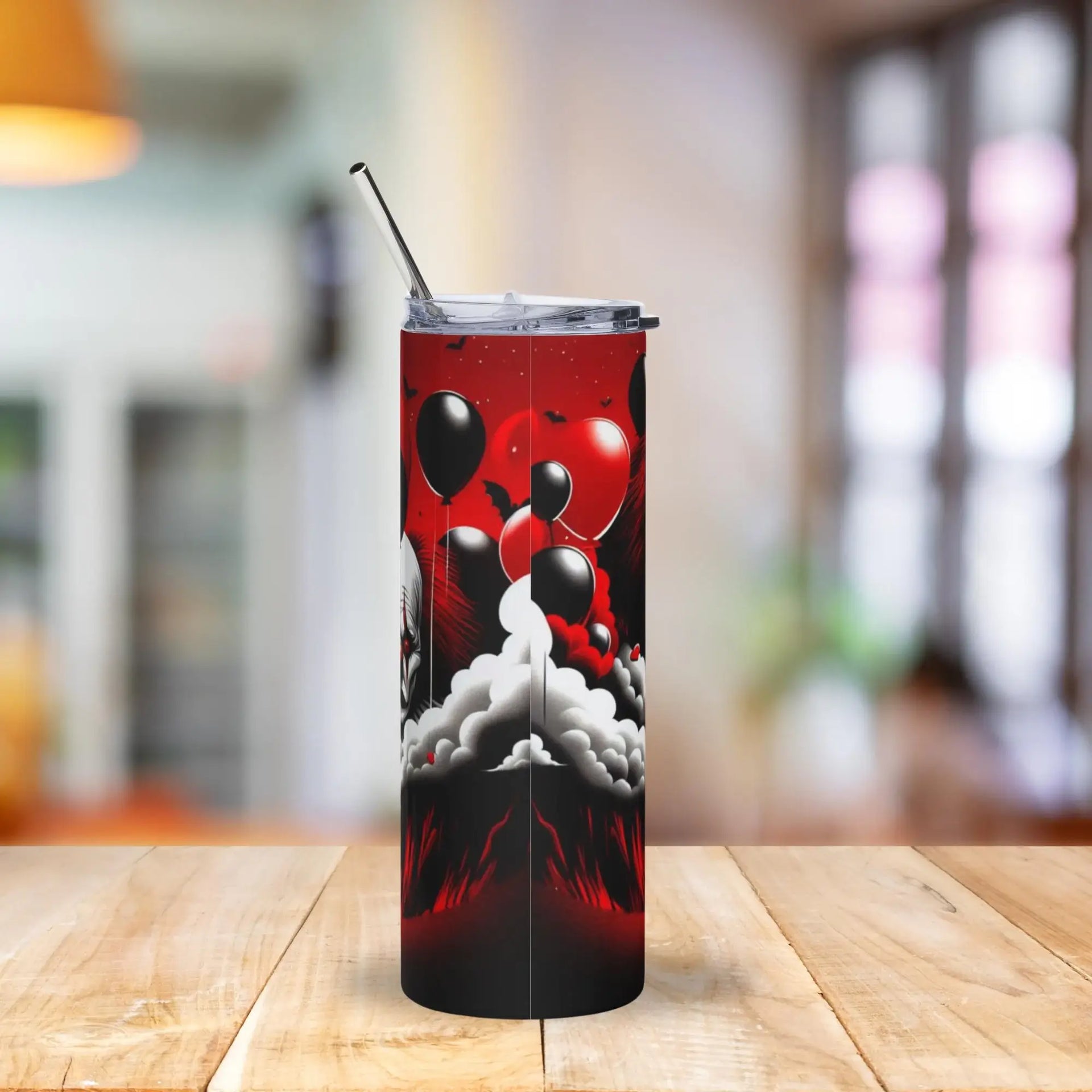 Creepy Clown Horror Tumbler | 20oz Stainless Steel Cup with Red & Black Balloon Design