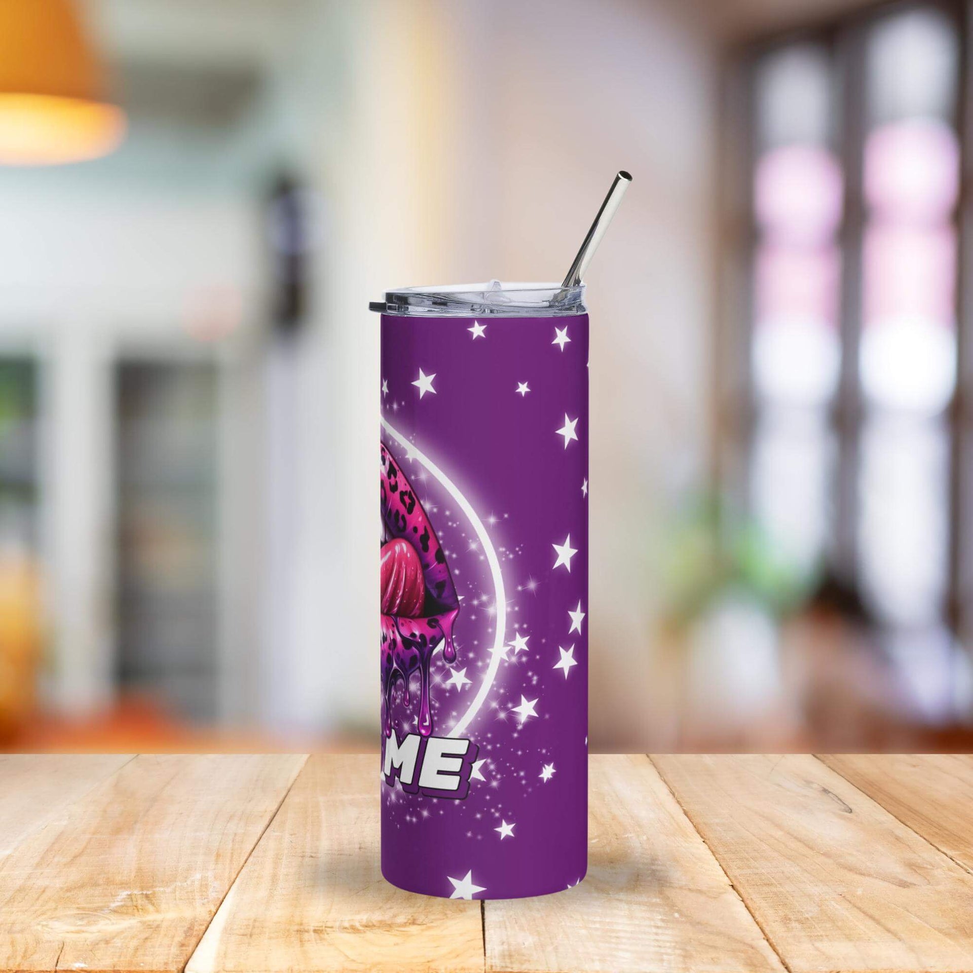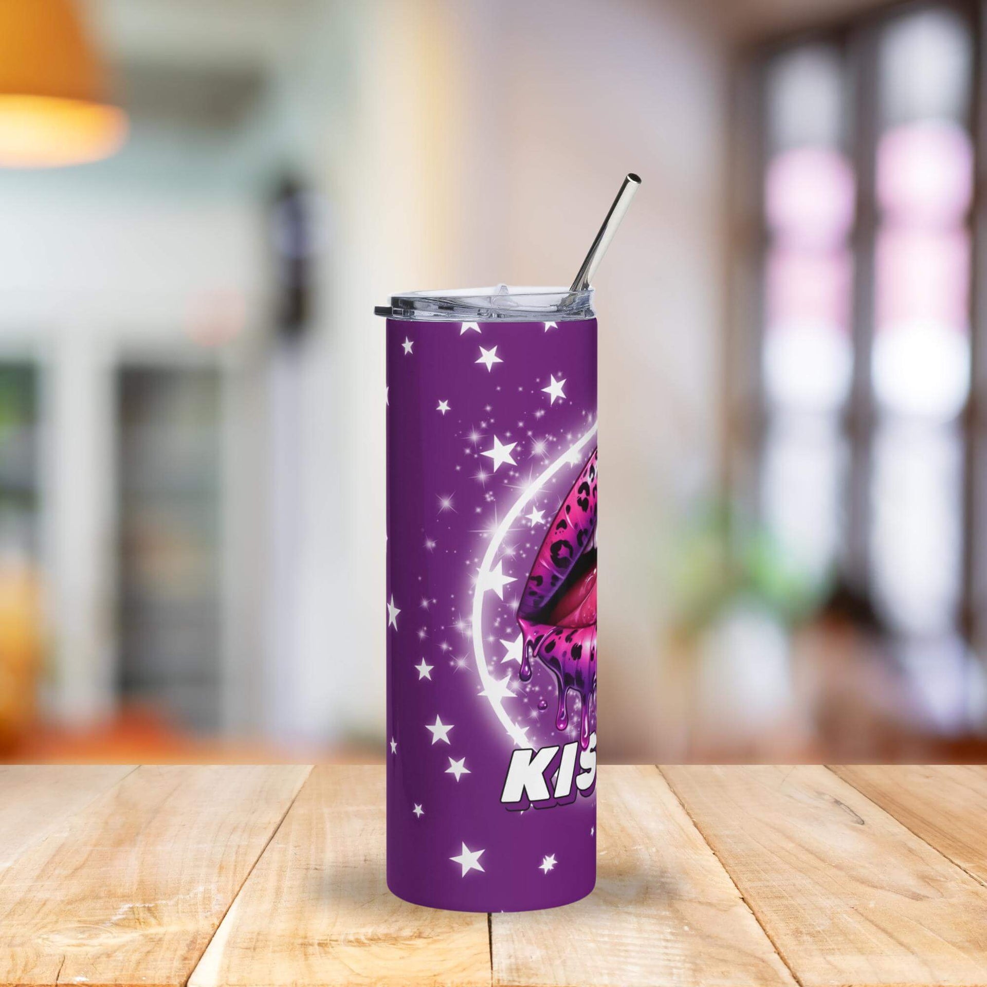 Turn heads with the bold and playful Kiss Me Purple Leopard Lips Tumbler! This 20oz stainless steel cup features an eye-catching design with dripping pink leopard lips, a cheeky “KISS ME” statement, and a cosmic backdrop of twinkling white stars on a deep purple base. Perfect for making a statement wherever you sip.