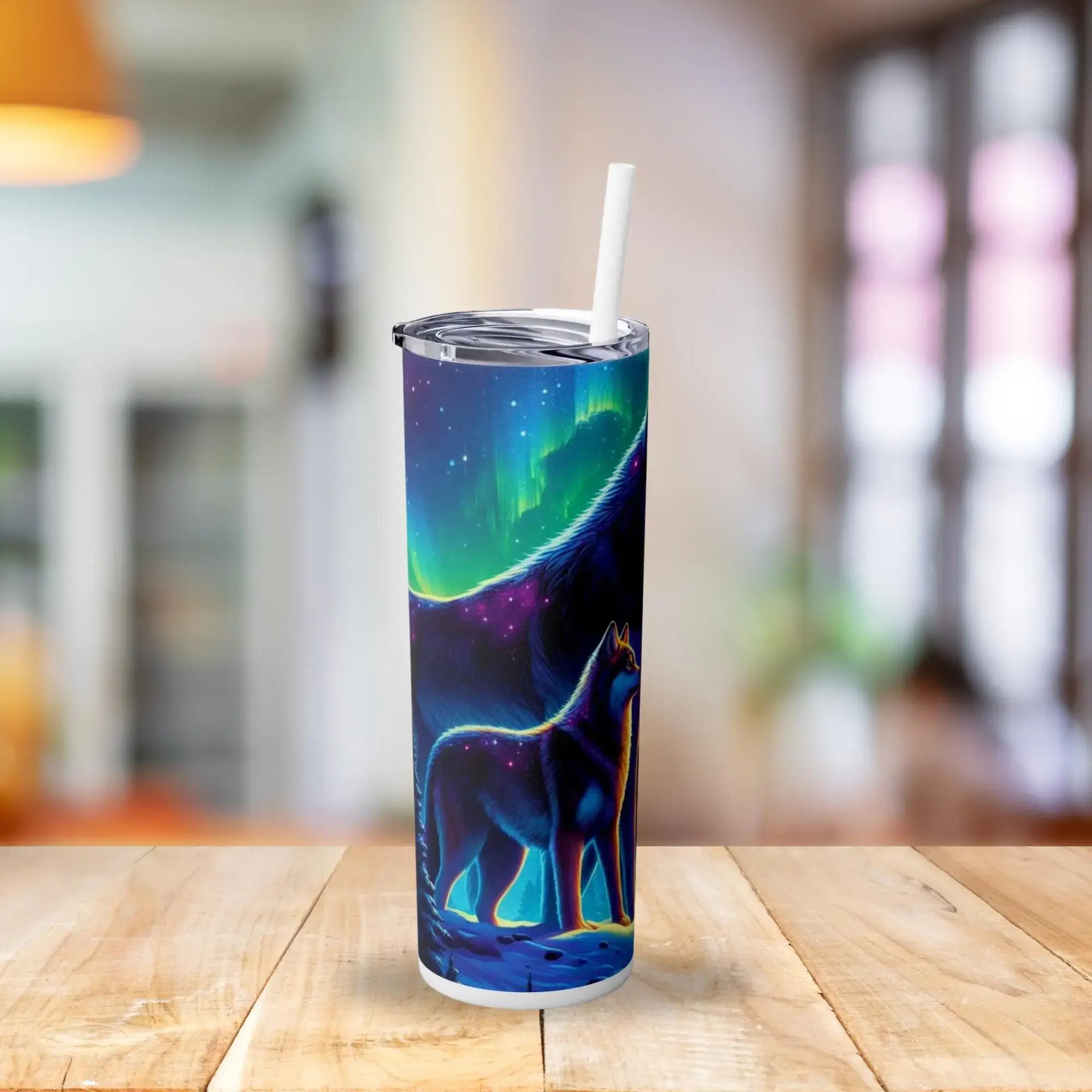 Northern Lights Wolf Tumbler | 20oz Stainless Steel Cup with Vibrant Aurora & Wolf Pack Design