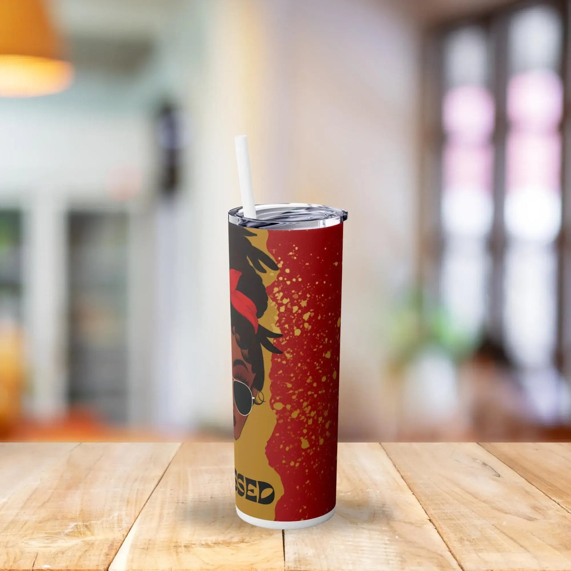 Sip confidently with the Blessed Beauty Tumbler—a vibrant 20oz stainless steel cup featuring bold Afrocentric artwork that celebrates confidence, heritage, and empowerment. Adorned with a stunning illustration of a powerful Black woman in sunglasses and a red headwrap, framed by radiant gold and red splatter textures, this tumbler is a tribute to beauty, pride, and self-love.