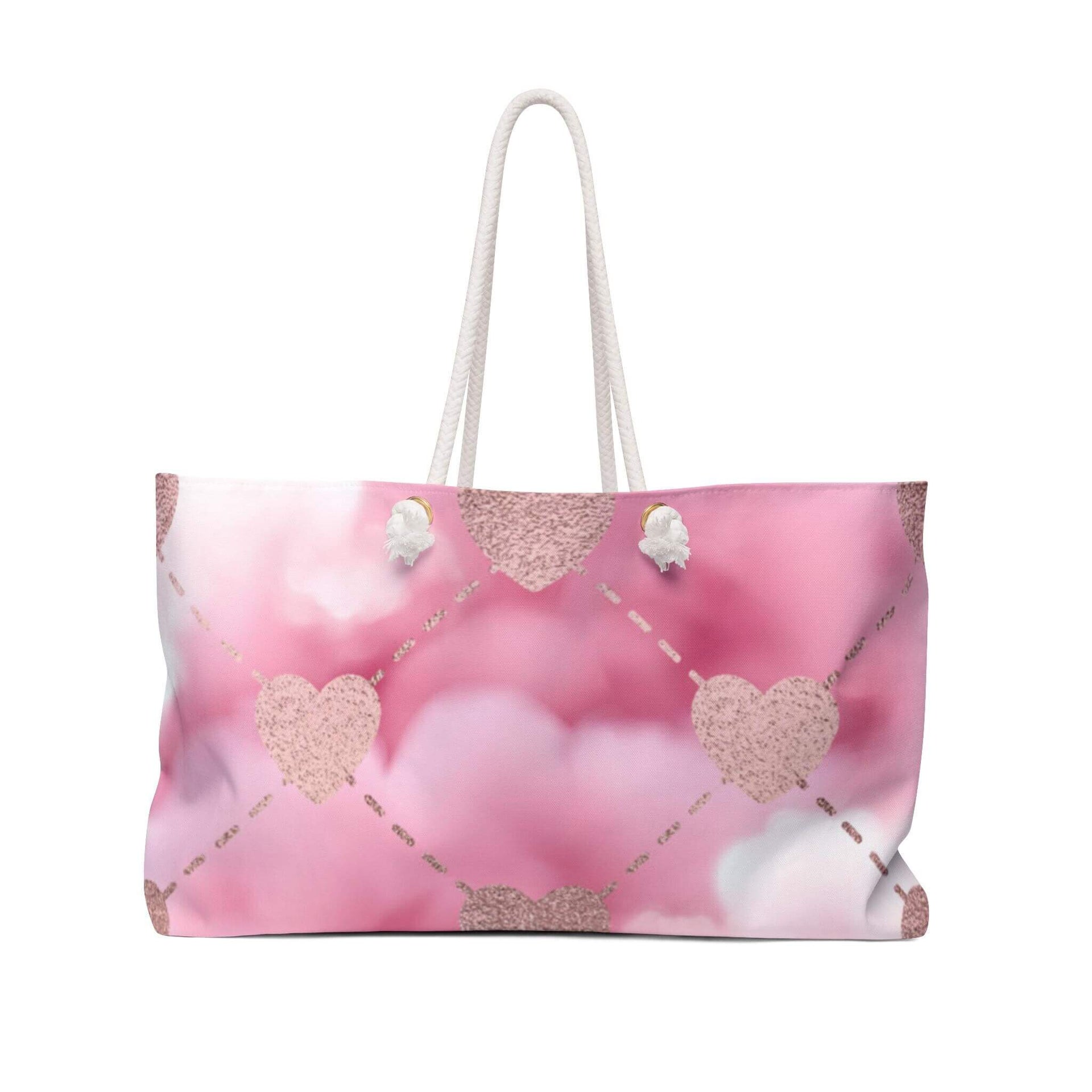 Carry love and style wherever you go with the Love in Bloom Tote. Featuring a charming pink gradient design with glittery heart accents, this tote bag is both functional and fashionable. Perfect for a weekend getaway, trip to the beach, or casual day out, the oversized Weekender Tote is designed to hold all your essentials while adding a touch of elegance to your look.