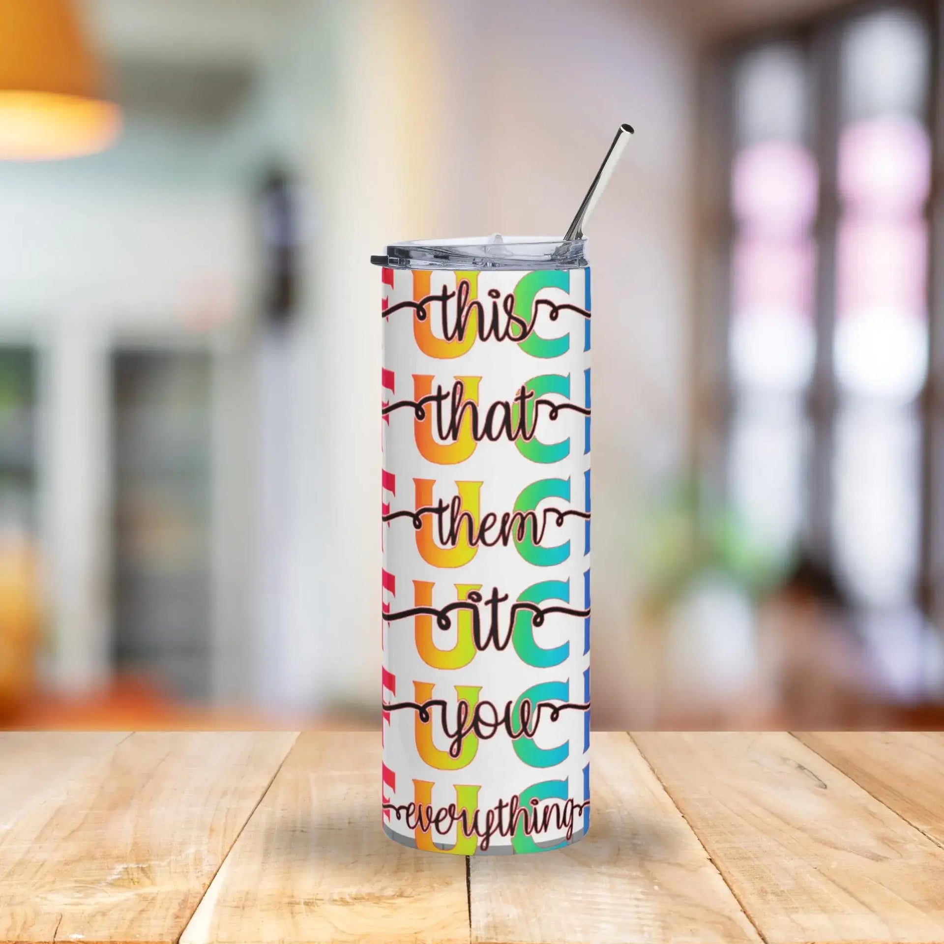 Bring a dose of sass and humor to your sip with the Bold Wordplay Tumbler—a vibrant 20oz stainless steel cup featuring playful typography and cheeky phrases that turn heads. Designed with bold block letters (U, C, K) paired with whimsical script words like this, that, them, it, you, and everything, this tumbler is a fun way to make a statement—without saying a word.